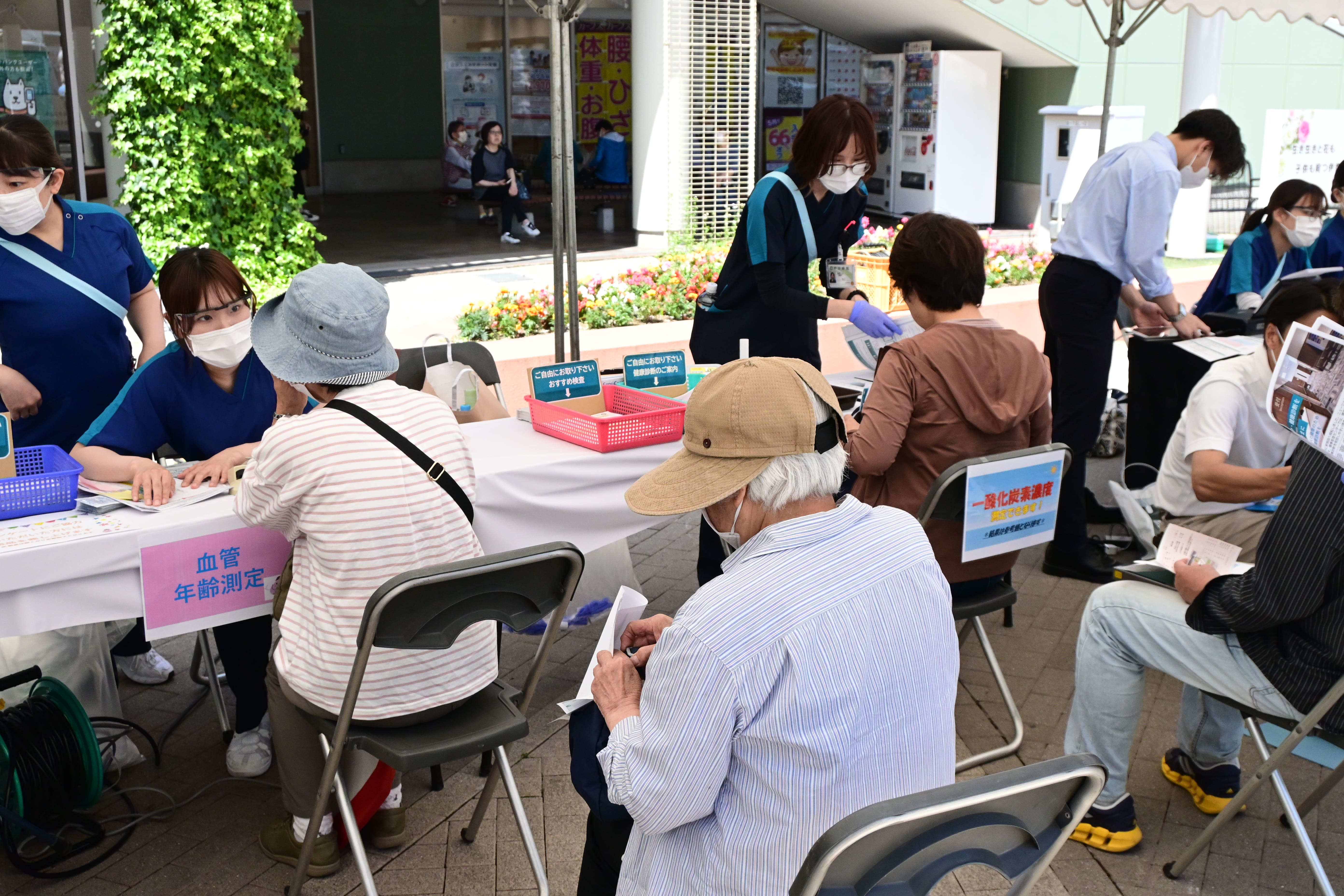 当日は栄養相談や骨密度測定に血管年齢測定、看護師と臨床工学技士による心臓マッサージ(AED)や理学療法士によるロコモ体操の実演など内容盛りだくさんのイベントとなりました。